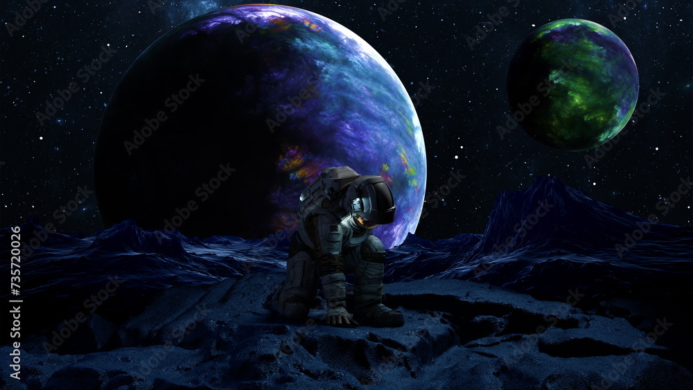 The watermark will not be included on Sticker.: Space astronaut explores distant planet - cosmonaut in a spacesuit touches the ground of an asteroid -