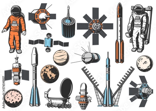 The watermark will not be included on Sticker.: Space exploration icons set - astronaut in spacesuit on maneuvering unit, natural and artificial sate