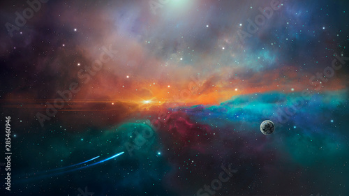 The watermark will not be included on Sticker.: Space scene - colorful nebula with planet and two trail - elements furnished by nasa - 3d rendering