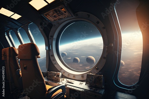 Sticker spaceship dark interior with view on distant planets solar system. generative ai aig15.