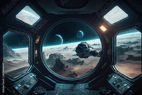 Sticker spaceship dark interior with view on distant planets solar system. generative ai aig15.