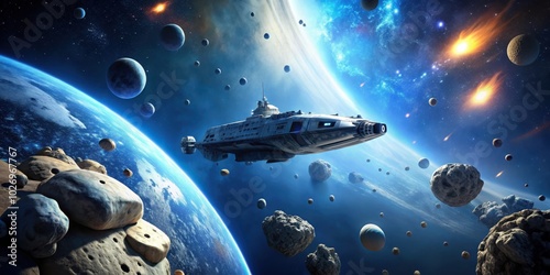 Spaceship floating in outer space surrounded by asteroids, spaceship, outer space, asteroids, floatiSticker