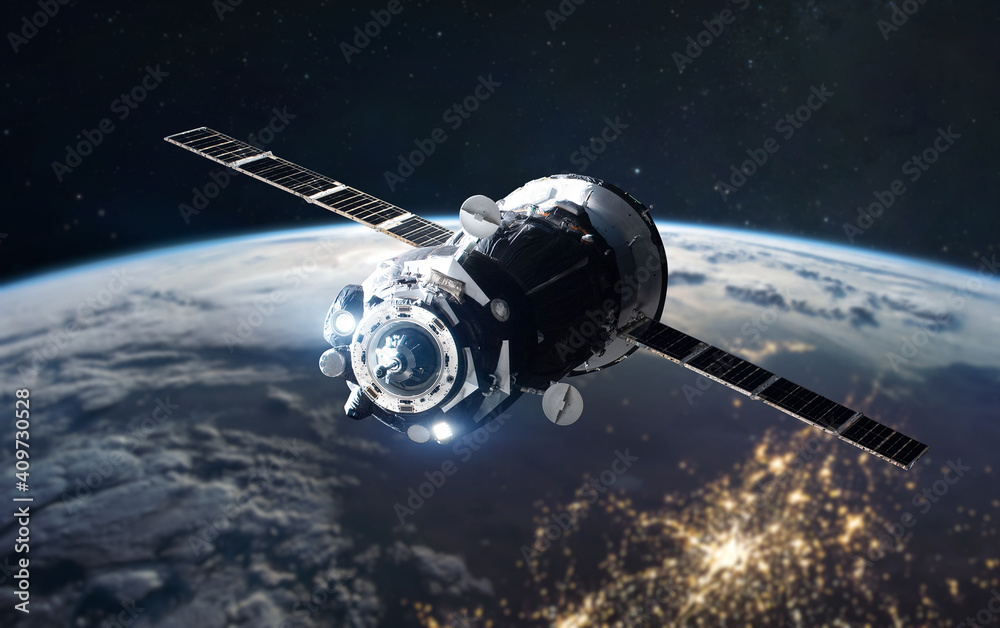 Sticker spaceship over earth in outer space. solar system. city lights at night. elements of this image furn