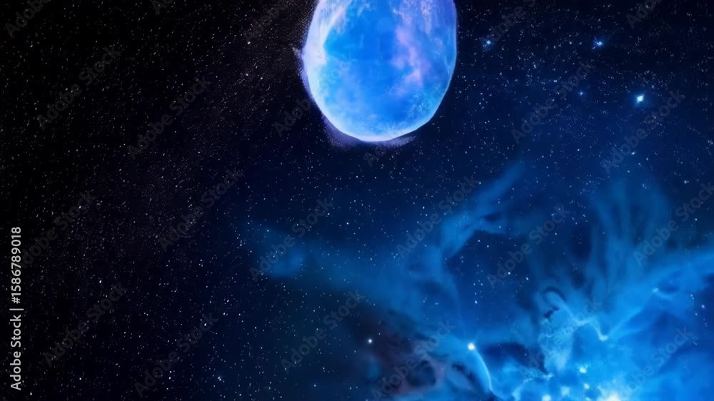 The watermark will not be included on Sticker.: Spectacular deep blue nebula with distant moon and sparkling stars floating gently through the infin