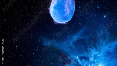 Spectacular deep blue nebula with distant moon and sparkling stars floating gently through the infinSticker