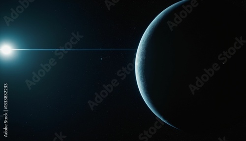 Sticker : Spherical planet with a subtle blue atmospheric glow is partially illuminated by a bright, distant s