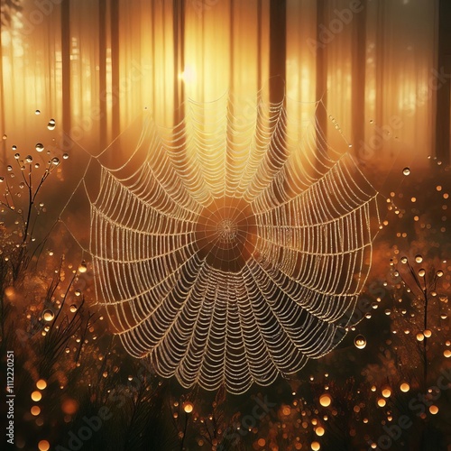 Sticker spider web with morning dew a spider web glistens with tiny dew