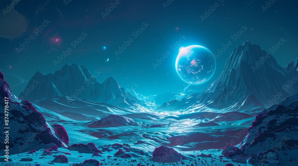 The watermark will not be included on Sticker.: Stylized depiction of a futuristic space exploration scene with multiple planets generative ai