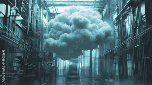 The watermark will not be included on Sticker.: Surreal architecture with a giant cloud inside a metallic room - generative ai image - [dream architec