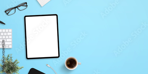 Sticker : Tablet mockup on blue work desk with plenty of space for text - top view, flat lay scene with up of c