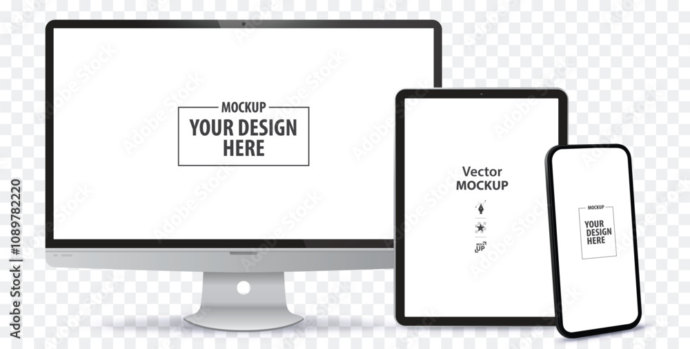 Sticker : Tablet pc, mobile phone and desktop computer monitor screen mockup - digital devices template vector