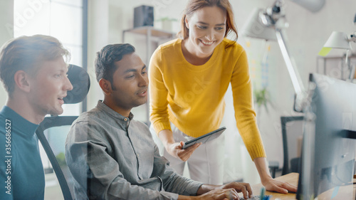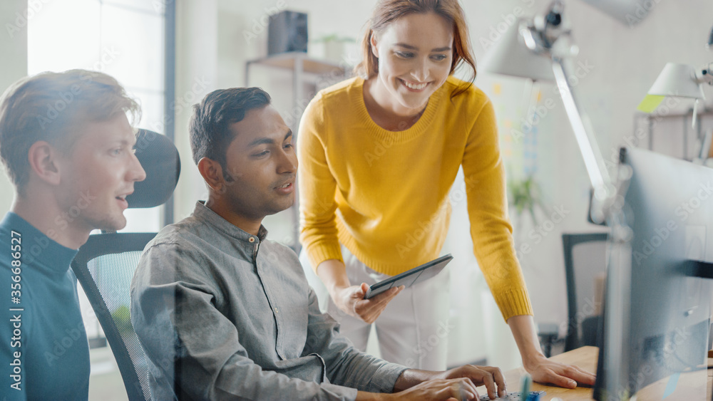 The watermark will not be included on Sticker.: Talented entrepreneur working on his desktop computer with project manager and team leader standing