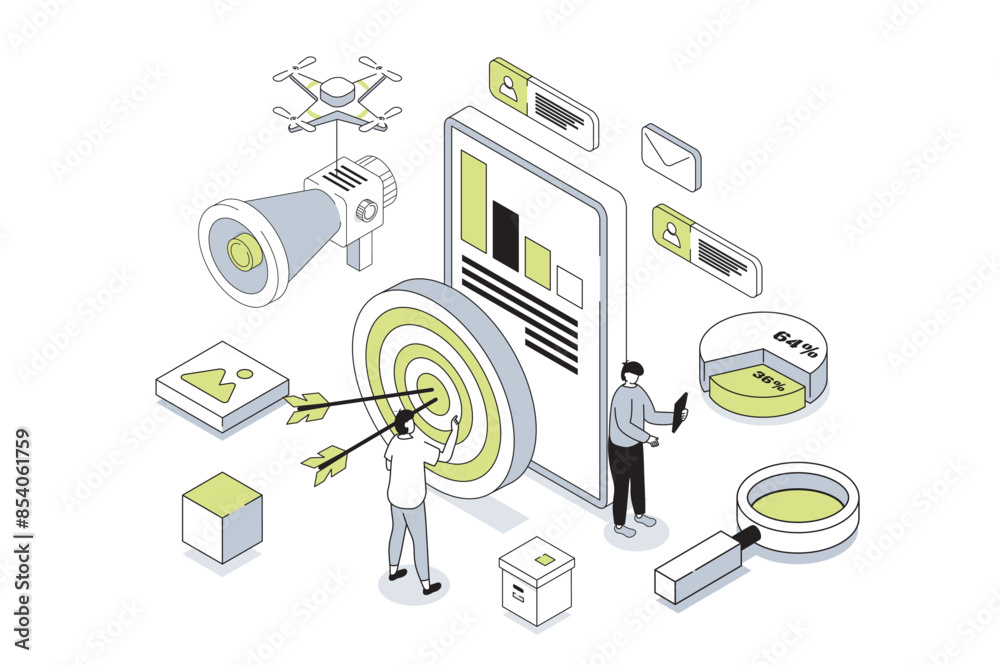 Sticker target audience 3d isometric concept in outline isometry design for web. people study market data an - Stickers Sticker target audience 3d isometric concept in outline isometry design for web. people study market data an - Stickers