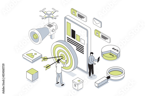 Sticker target audience 3d isometric concept in outline isometry design for web. people study market data an