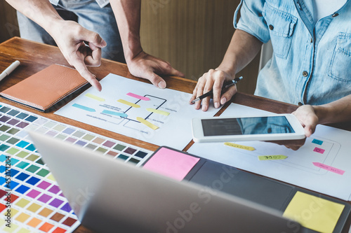 Team of creative web/graphic designer planning, drawing website ux app for mobile phone application Sticker