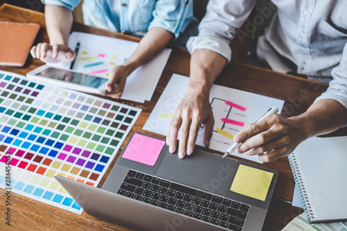 Team of creative web/graphic designer planning, drawing website ux app for mobile phone application Sticker
