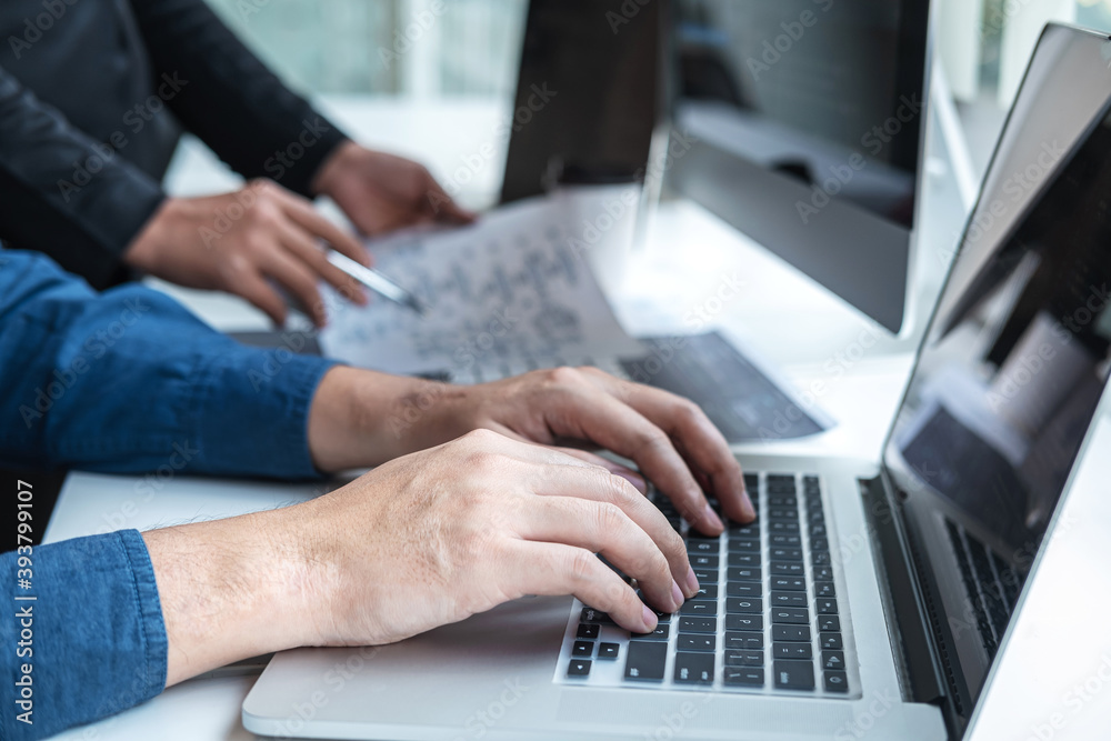 The watermark will not be included on Sticker.: Team of professional developer programmer cooperation meeting and brainstorming and programming in w