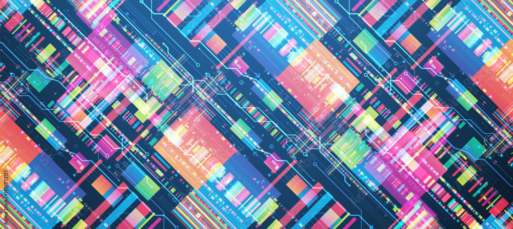The watermark will not be included on Sticker.: Technological background with colorful squares glowing on a blue gradient -