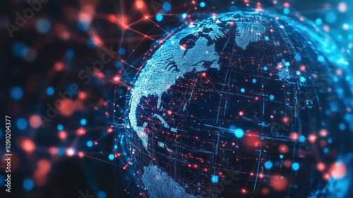 The watermark will not be included on Sticker.: The globe is enveloped in a blue and red digital network on a dark background, symbolizing connectiv