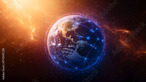 The watermark will not be included on Sticker.: The image shows earth in space, surrounded by a network of blue lines and points, set against a back