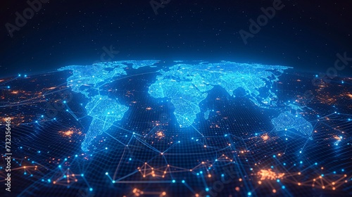 Sticker the interconnectedness of a worldwide network shown through a world map with dots and lines, represe