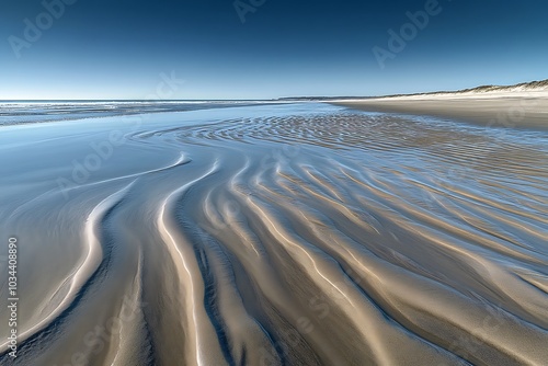 Sticker the ocean tide receding over a smooth sandy beach leaving intricate patterns in the wet sand under a