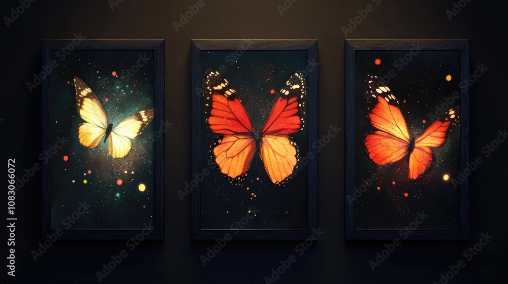 The watermark will not be included on Sticker.: Three illuminated rectangular banners featuring enchanting butterflies on a dark backdrop