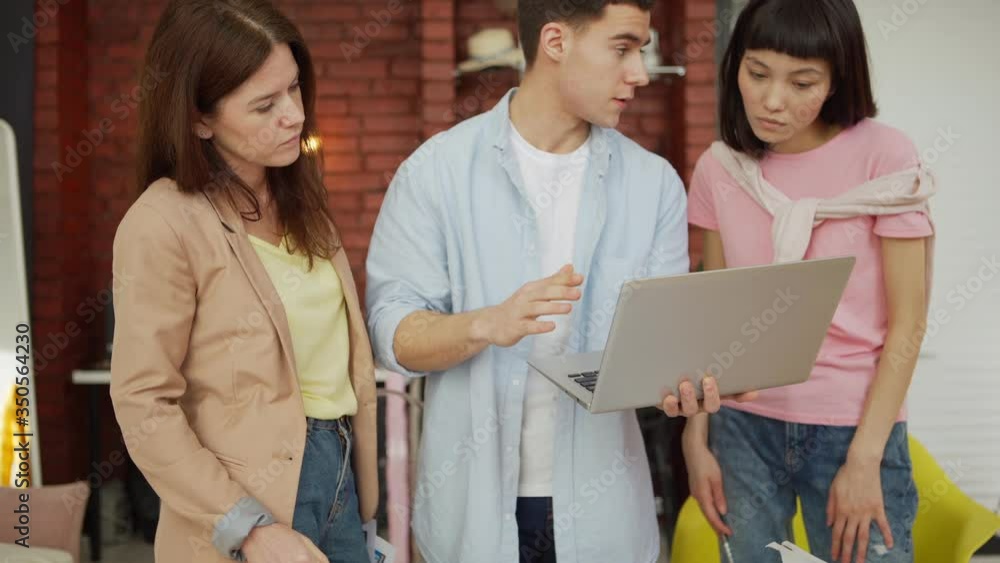 Sticker : Tilt up medium shot of creative startup business team of three discussing website interface template