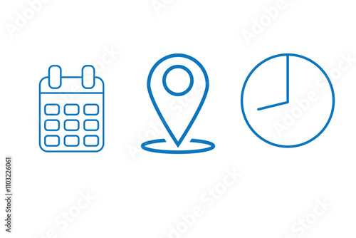 Time, date and address icon set - calendar, clock, location - editable stroke - linear vector outline iSticker