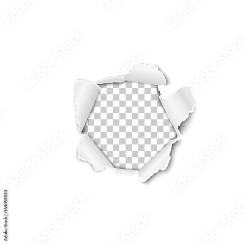The watermark will not be included on Sticker.: Torn hole in the sheet of white paper - transparent background of the resulting window - vector templa