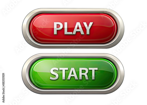 Sticker two glossy buttons with metallic borders, one red with the word play and the other green with the wo
