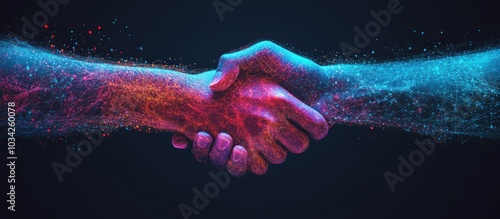 The watermark will not be included on Sticker.: Two hands shake in a digital handshake with glowing particles, creating a bond of connection -