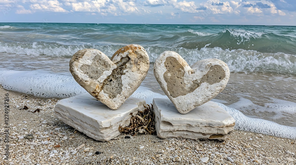 Sticker two heart-shaped stones sit on a sandy beach, with gentle waves lapping at the shore under a cloudy  - Stickers Sticker two heart-shaped stones sit on a sandy beach, with gentle waves lapping at the shore under a cloudy - Stickers
