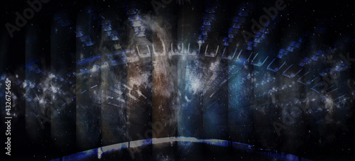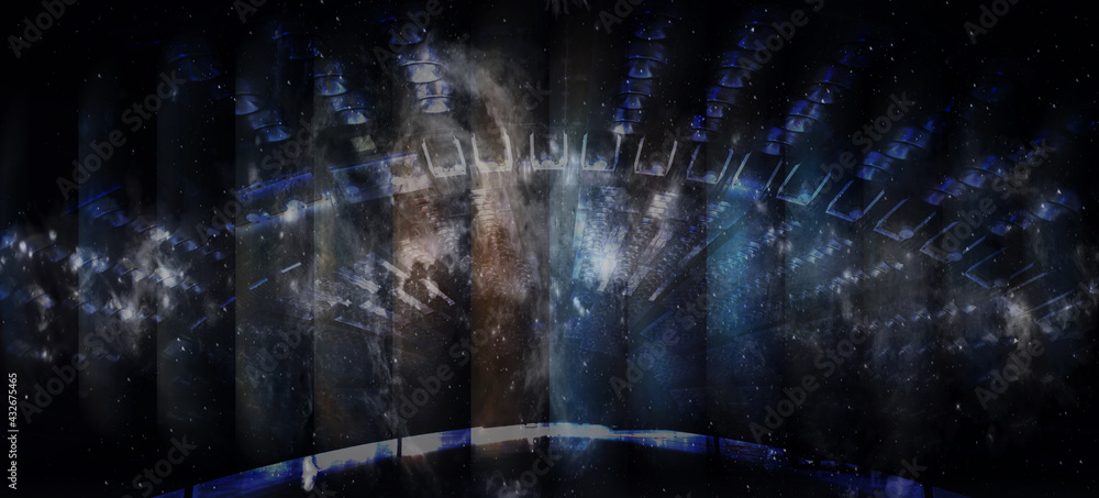 Sticker ufo in stripes light in space. elements of this image furnished by nasa.