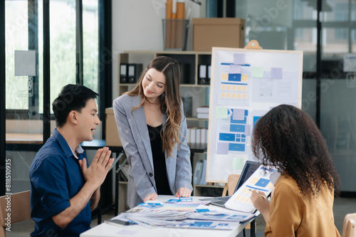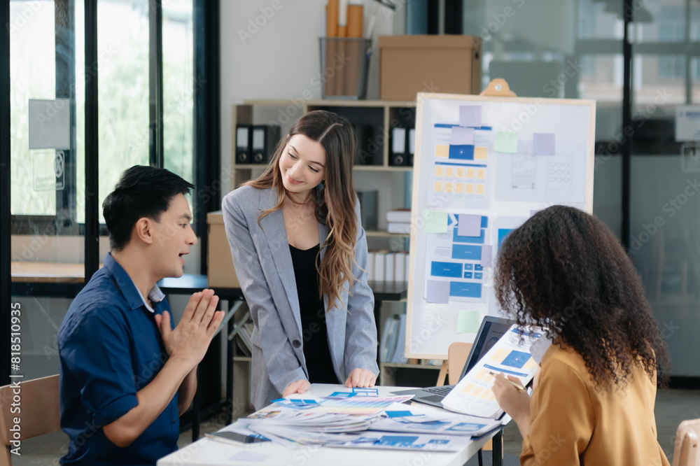 The watermark will not be included on Sticker.: Ui developer team brainstorming on their project with laptop, smartphone and digital tablet - creativ