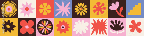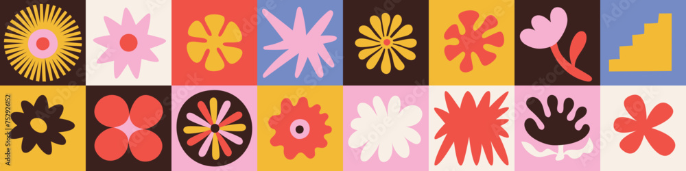 Sticker vector set of abstract creative backgrounds in minimal trendy style with geometric flowers - design
