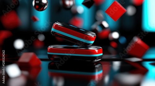 The watermark will not be included on Sticker.: Vibrant abstract scene featuring floating geometric shapes and two stacked red and black boxes