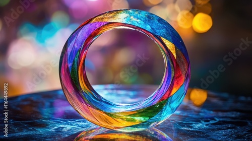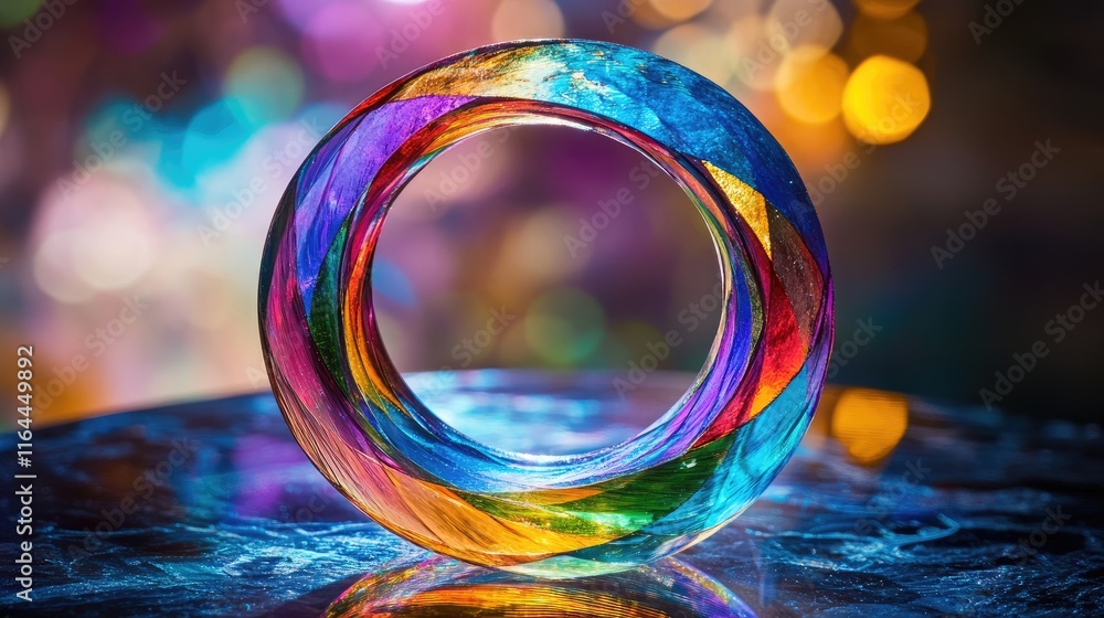 Sticker vibrant glass circle artwork illuminated by colorful bokeh lights creating a stunning visual composi