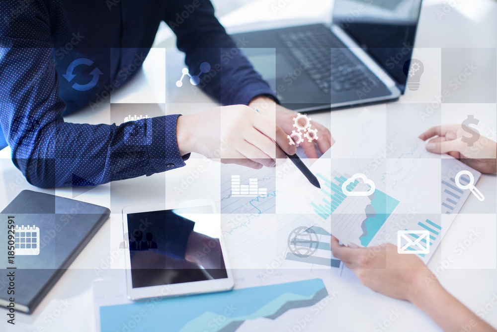 The watermark will not be included on Sticker.: Virtual screen interface with applications icons - apps - work business process in modern office - stra
