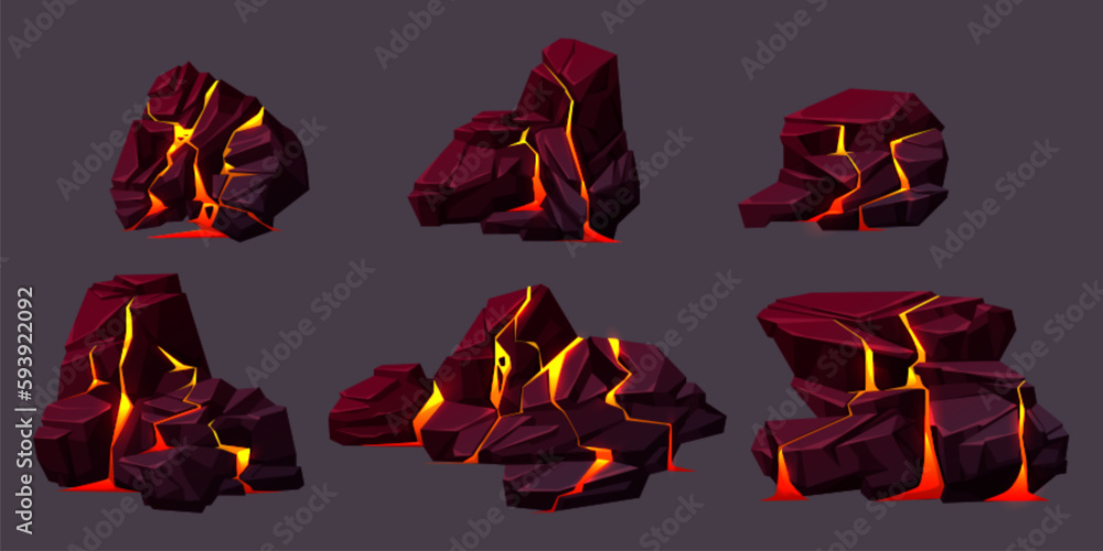Sticker volcano boulder texture with lava in cracks and broken stones. volcanic rocks with light effect in f