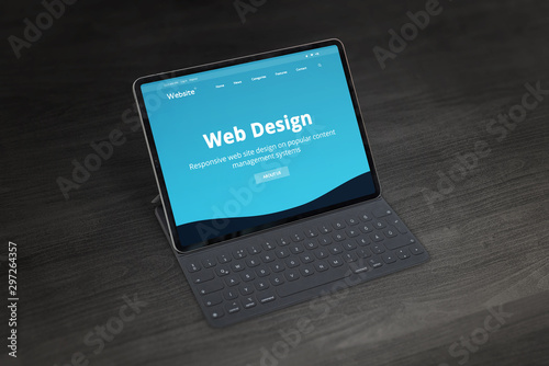 The watermark will not be included on Sticker.: Web design studio promo web site on tablet with keyboard on office desk - responsive web design promo