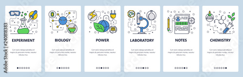The watermark will not be included on Sticker.: Web site onboarding screens - science experiment in lab - chemisty, biology - menu vector banner templa