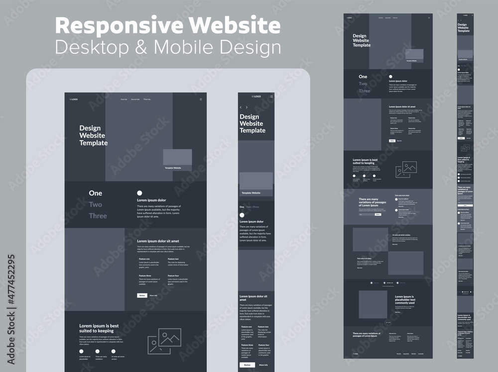 The watermark will not be included on Sticker.: Website design dark mode - responsive desktop and mobile wireframe - landing page template -