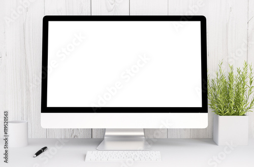 The watermark will not be included on Sticker.: White workspace with mockup computer
