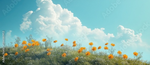 Sticker yellow flowers on a hill beneath a blue cloudy sky. with copy space image. place for adding text or