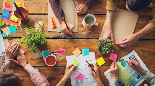 Wall mural : ?lose-up view of several hands collaboratively working on a project with colorful sticky notes, pape
