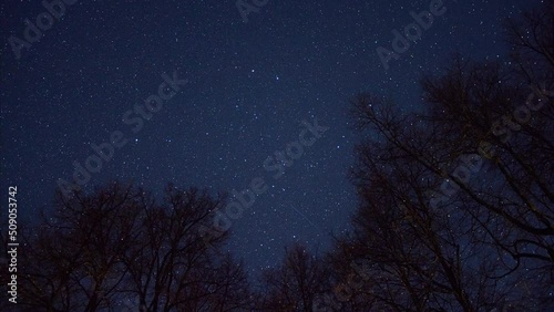 Wall mural ночное звездное небо. звезды вращаются вокруг полярной звезды на фоне деревьев.