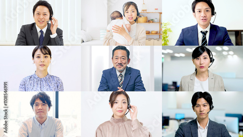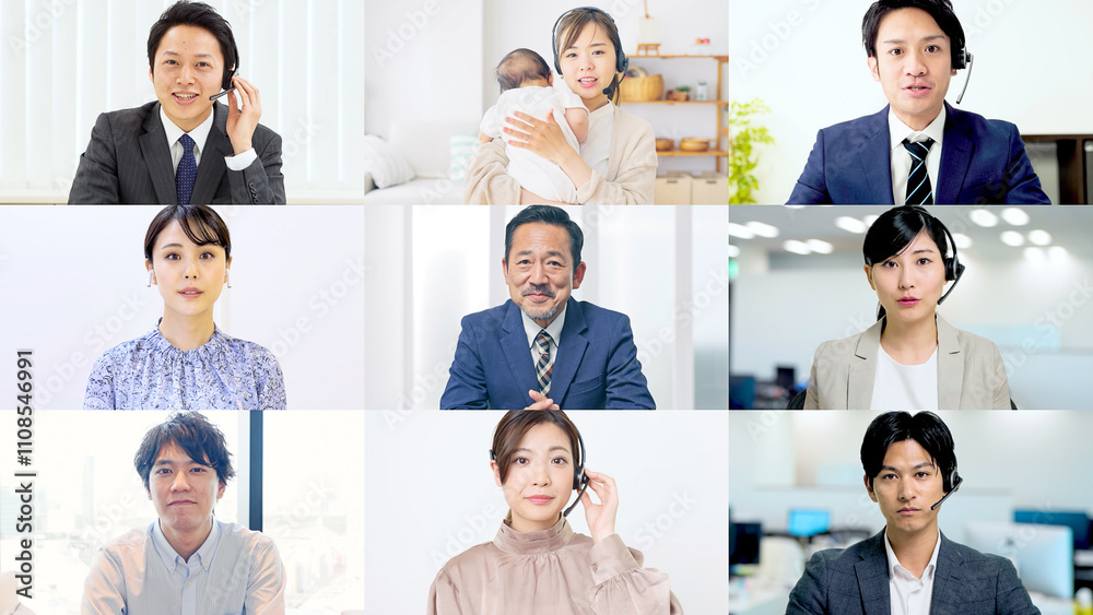 Wall mural ビデオ会議、ビデオ通話、web会議、ビジネス、話す、ミーティング、会議、セミナー、チーム、zoom、会話、カンファレンス、ビデオ、テレビ、日本人、コラージュ、タイトル、テンプレート、イメージ、広告、多