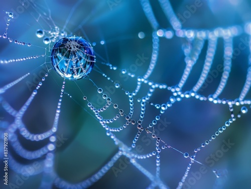Wall mural a captivating image of a water droplet clinging to a spider web, with the web strands forming an int