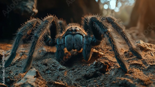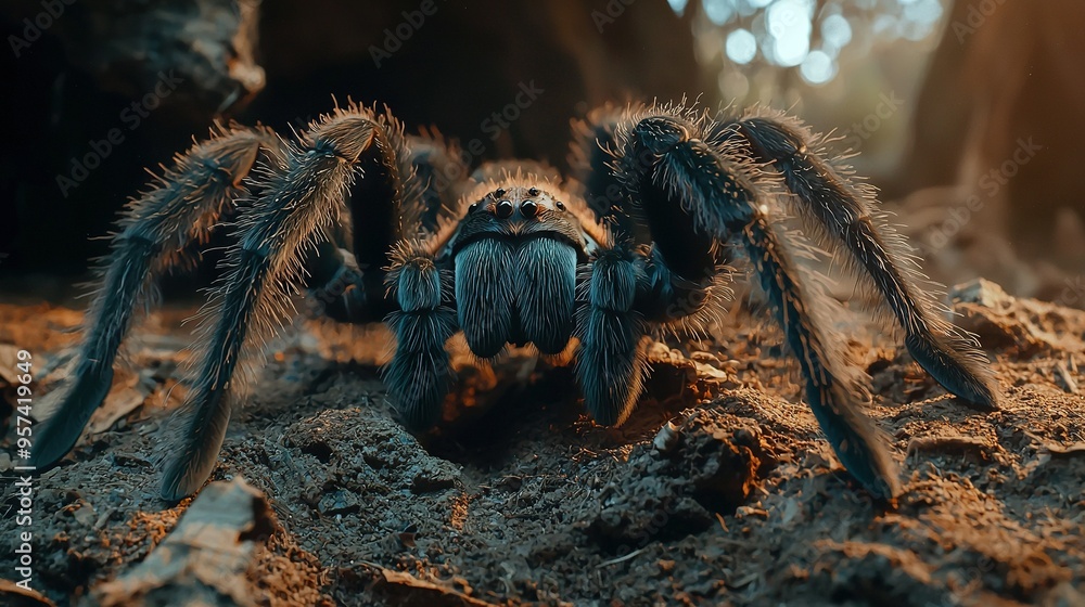 Wall mural   A close-up of a spider on the ground with a blurry background behind it and a tree in the distance - Wall murals Wall mural A close-up of a spider on the ground with a blurry background behind it and a tree in the distance - Wall murals